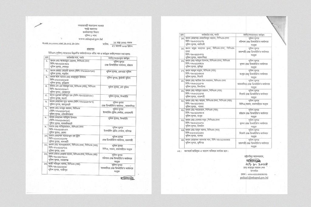 আজ মঙ্গলবার স্বরাষ্ট্র মন্ত্রণালয়ের জননিরাপত্তা বিভাগ পুলিশ-১ শাখা থেকে জারি করা প্রজ্ঞাপনে ২৪ জেলার পুলিশ কর্মকর্তার এই বদলি ও পদায়নের প্রজ্ঞাপন জারি করা হয়। রাষ্ট্রপতির আদেশক্রমে প্রজ্ঞাপনে সই করেন উপসচিব মো. মাহাবুর রহমান শেখ।